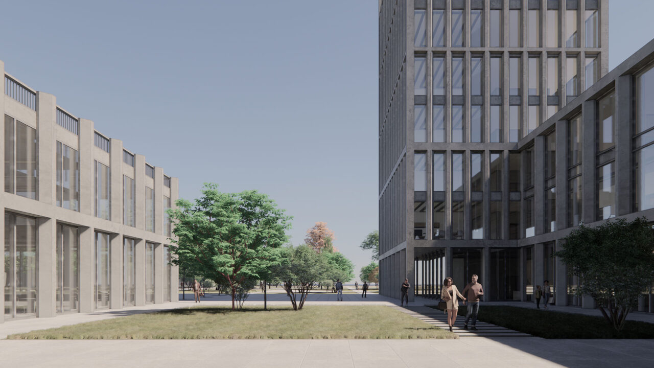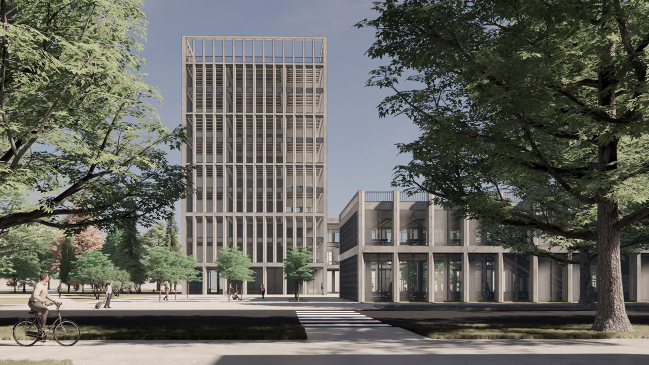 at Politecnico di Milano’s Città Studi campus. Designed as a place for learning, innovation, and growth, the building brings together classrooms, study pods, an auditorium, DASTU practice offices, and spaces for startups. A symbolic vertical rhythm defines the design: students at the base, graduates in the middle, and professors above – reflected in a grid that becomes lighter as it rises.